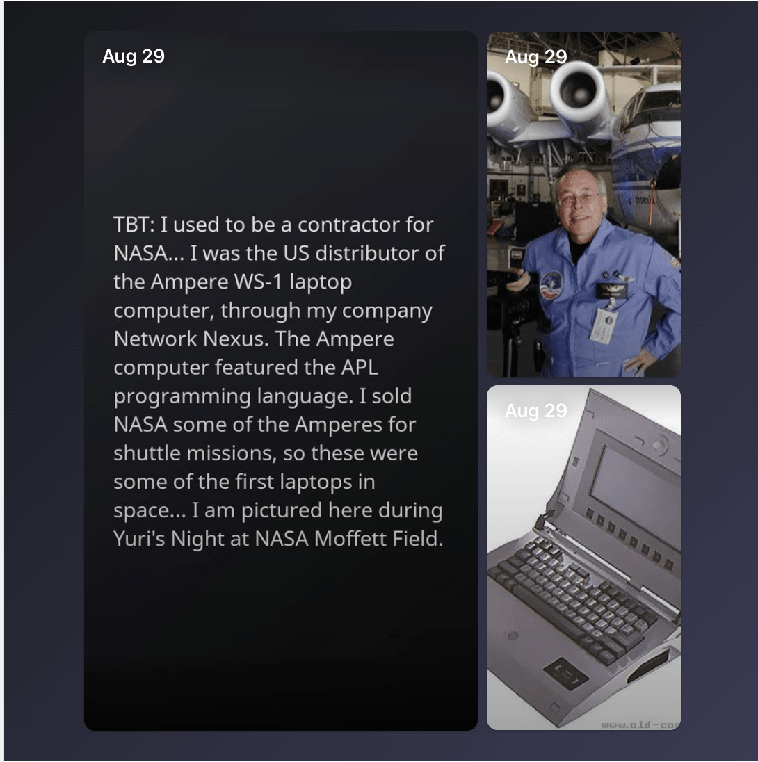 When I left Orange County Department of Mental Health, and moved up to Redwood /city California to do dolphin research with Dr. John Lilly, I aslo started a company across the street. I started Network Nexus to be a computer reseller and developer. Network Nexus became the national distrbutor of the Ampere WS-1 laptop. These were Japanese-built APL computers, which allowed transfer of programs from the IBM mainframe computers, for use in flight. These laptops were used on the NASA Space Shuttle at NASA Moffett Field, California. I was also a dealer for Sage and Stride Computers, and built servers and networks based on their hardware. I built computers for Stanford Linear Accellerator Center, Industrial Light & Magic, and other clients like Apple developers that would use them for Macintosh software develpment in the early days.
